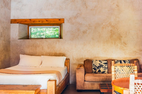 The GREB straw bale house is a distinctive handcrafted blend of timber frame and straw bale construction. Its breathable walls ensure comfort year-round, staying warm in winter and cool in summer. Set in a tranquil forest environment, it features expansive windows to embrace the natural surroundings.